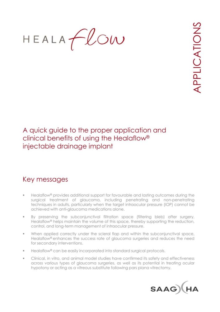 Healaflow ist ein viskoelastisches Implantat zur Unterstützung der Druckminderung in Kombination mit Trabekulektomie, Viscokanalostomie oder Tiefer Sklerektomie. Das gelartige Implantat wird unter den Skleraldeckel und die Bindehaut injiziert und löst sich über einige Monate hinweg auf, während es den durch den Eingriff entstandenen Platz zum verbesserten Abfluss des Kammerwassers offen hält. Die antiinflammatorische Wirkung verbunden mit seinen Eigentschaften als hochgradig hydrophiles Material fördert die Ausbildung eines wirkungsvollen „Bleb“ und hilft in vielen Fällen gleichzeitig dabei, eine starke Vernarbung des Sickerkissens zu minimieren. Es besteht aus NaHA, das durch Biofermentation hergestellt wird. Healaflow ist nicht-toxisch, nicht-tierischen Ursprungs und besitzt anti-inflammatorische Eigenschaften.